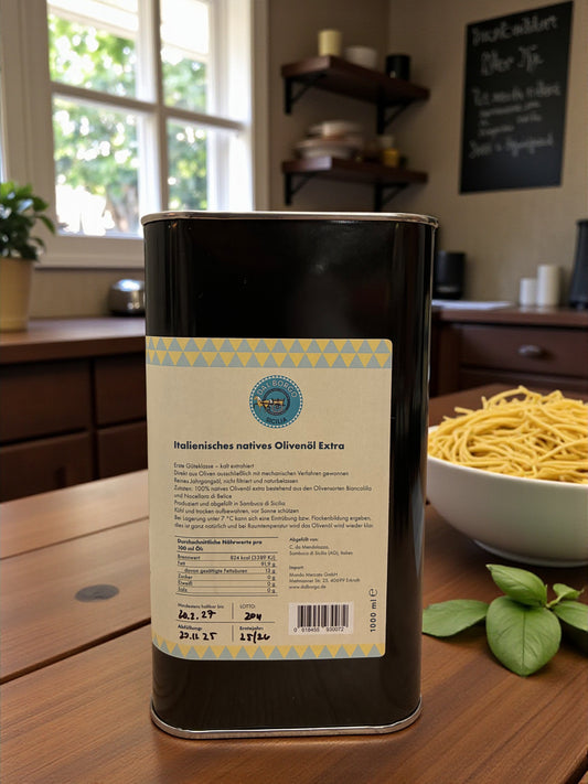 Neue Ernte: Nachhaltig erzeugtes sizilianisches Olivenöl Extra Vergine - 1 L Dose